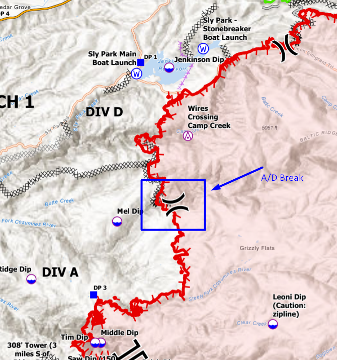 Just looking at the map, they’ve got a good start on some black line at the heel of the fire (where it came up out of the Cosumnes) in addition they have rocked a good amount of dozer line in the south and west. Looks like it’s going to tie into ME near 88. Plenty of dozer line in the Sly Park area, except there is a bunch a fuel between those and the fire line so not sure what the plan is there (dangerous to go down into the creeks).