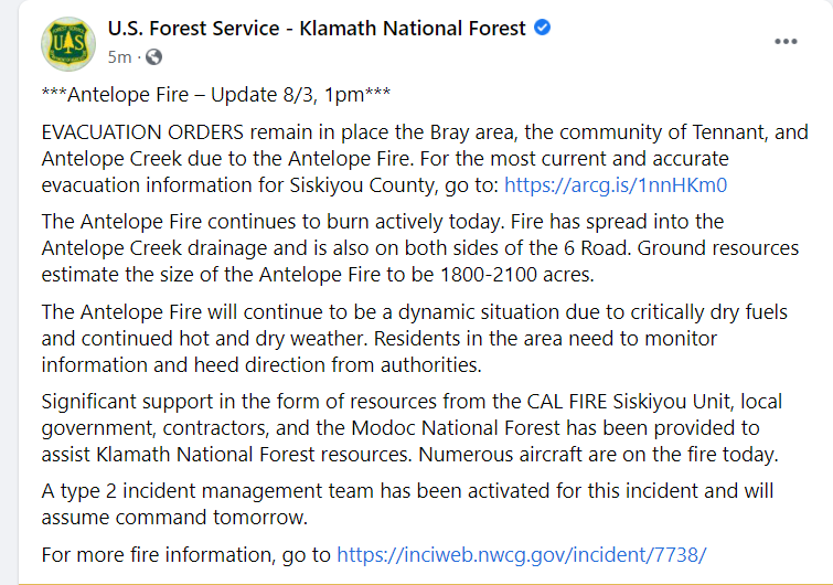 2,700 acres brush and timber, 0% contained. Active fire behavior with group torching and long-range spotting observed. Evacuation Orders have been issued for Tennant, Bray and Antelope Creek Ranch. Evacuation Warning for community of Tennant. Threats to private timberland, critical wildlife habitat, and to historical and cultural sites. A Red Flag Warning issued for gusty winds and low RH on 8/3 and 8/4. SW Type 2, Team 4 (Schwope) ordered, in-brief at 1800 tonight.