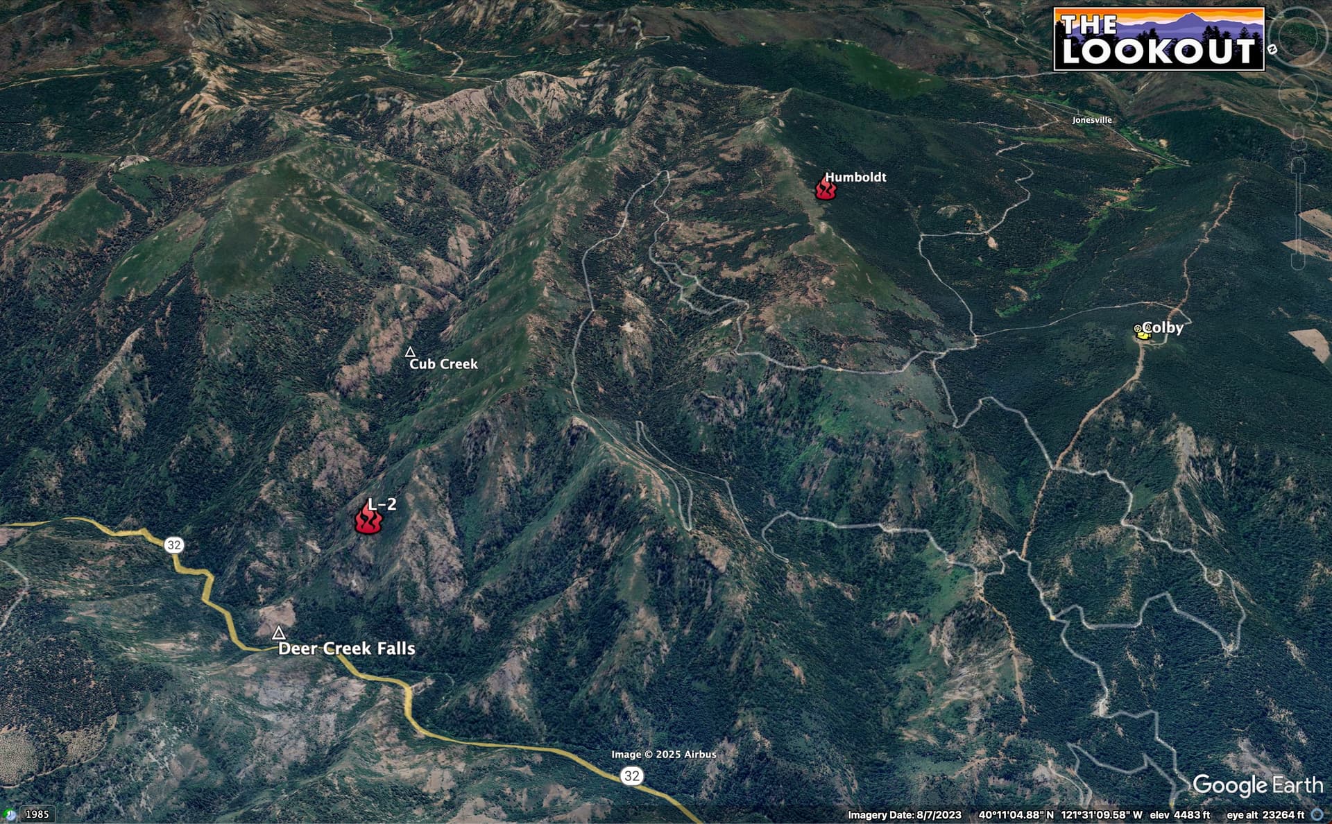 UPDATE: NIFC is showing the Deer Creek Falls-area fire as the L-2 Fire. The Humboldt Fire, on this map, is my guesstimate.