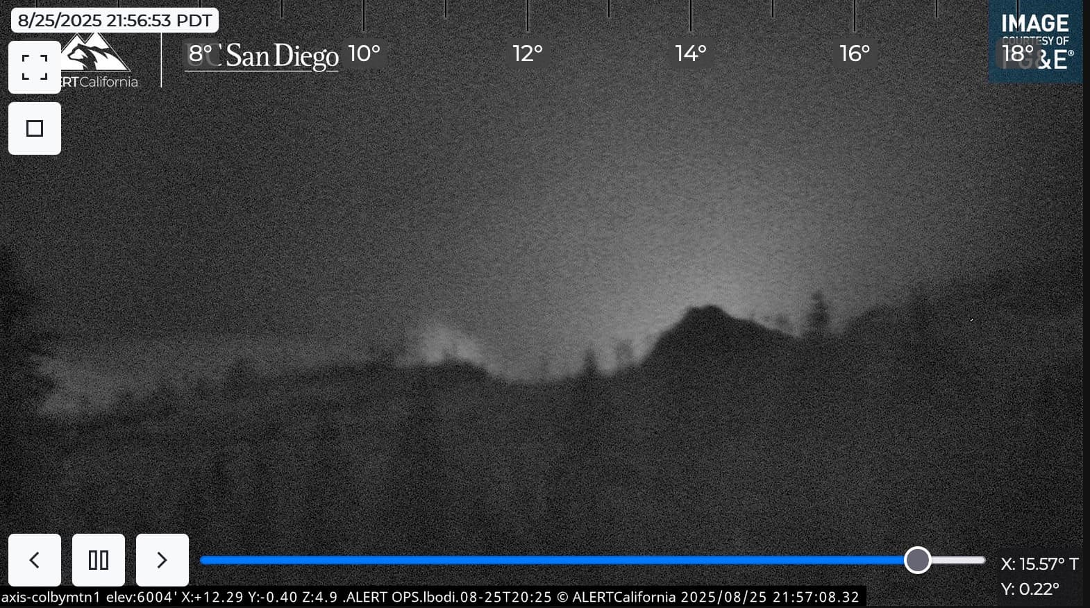 Two fires are visible on the Colby Mtn camera. One is in Cub Creek, east of Deer Creek Falls - likely in roadless area with no easy ground access. The other is on the ridge to the NW of Humboldt Summit. 9:45pm, 8/25/2025