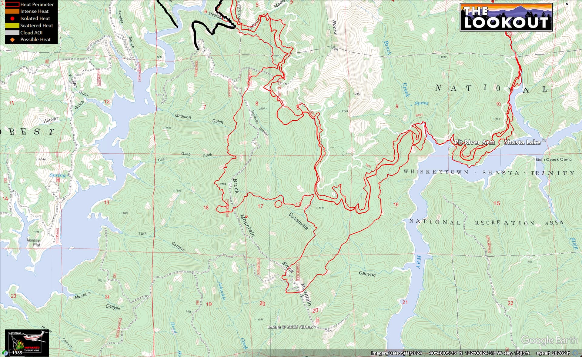 From the 11:45am FIRIS flight, and cams it looks like the pyro-cumulus action has been on the south flank of the fire, burning out the bowl on the north side of Brock Mountain.