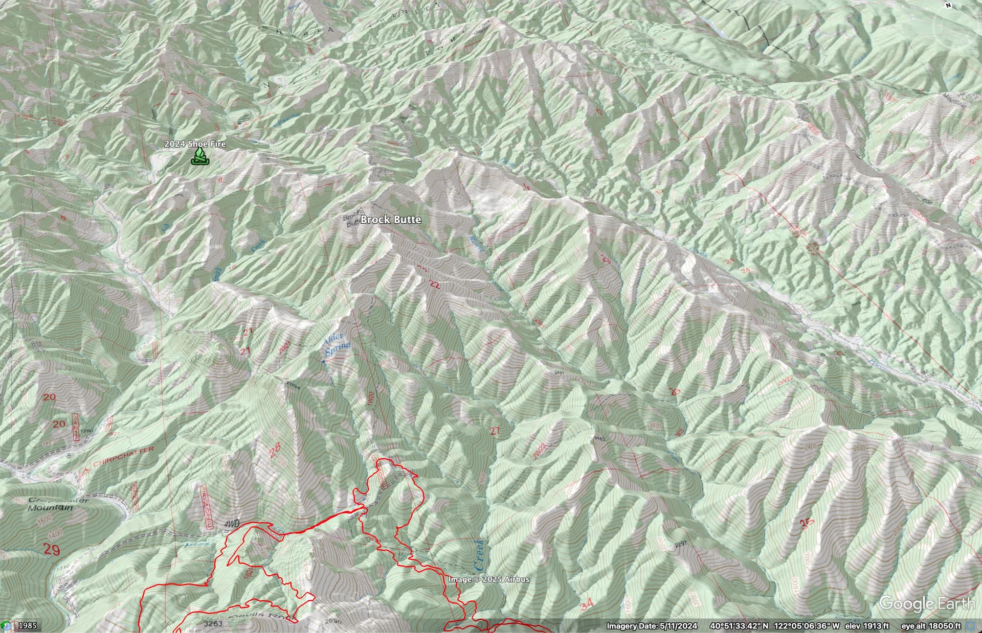 Yeah, after days of backing it finally got into alignment at the head of Flat Creek, and is taking out the basin on the east side of Brock Butte. Red lines are 14:45 FIRIS from 7/8/2025.