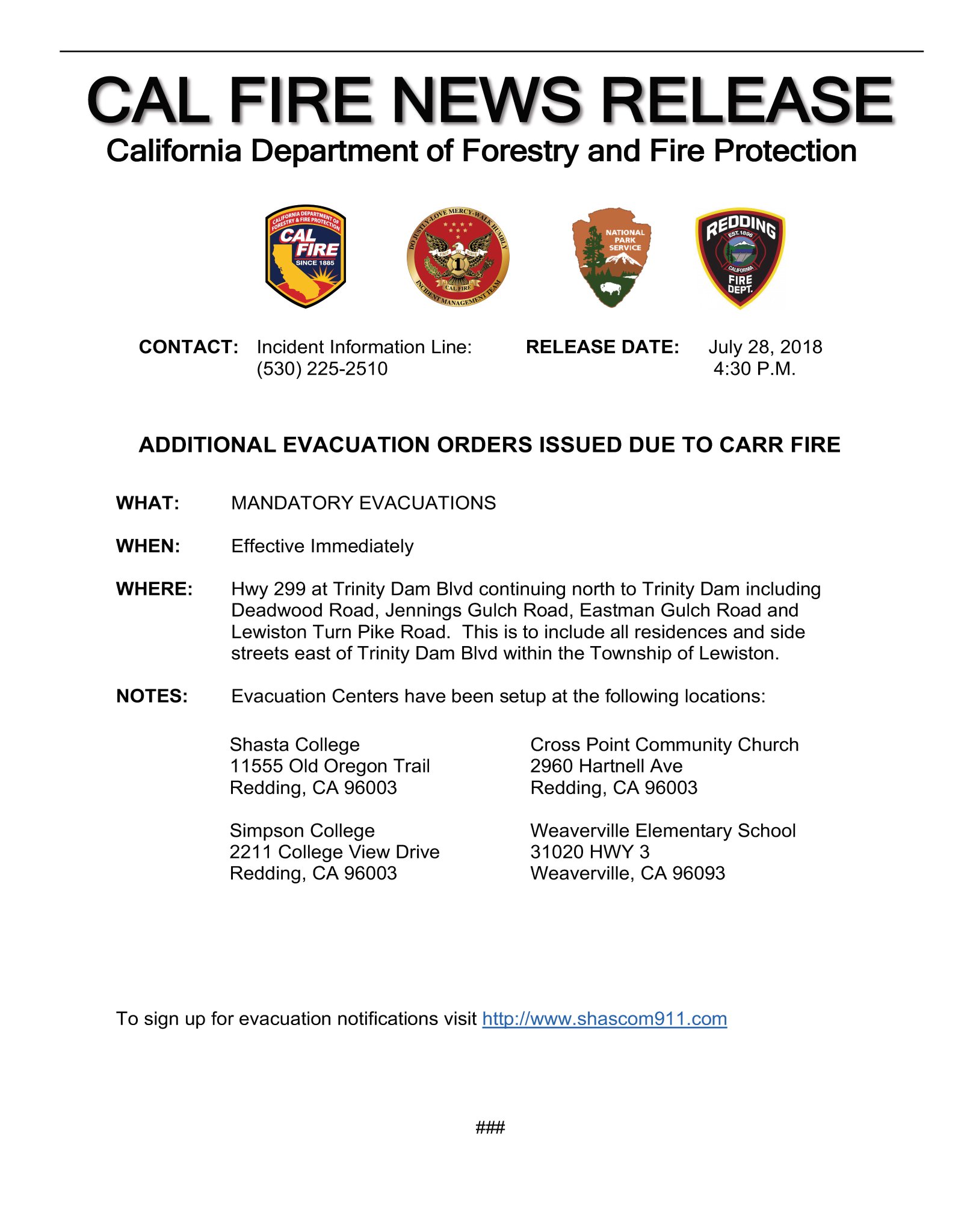 New evacuations in Lewiston, east of Trinity Dam Boulevard: