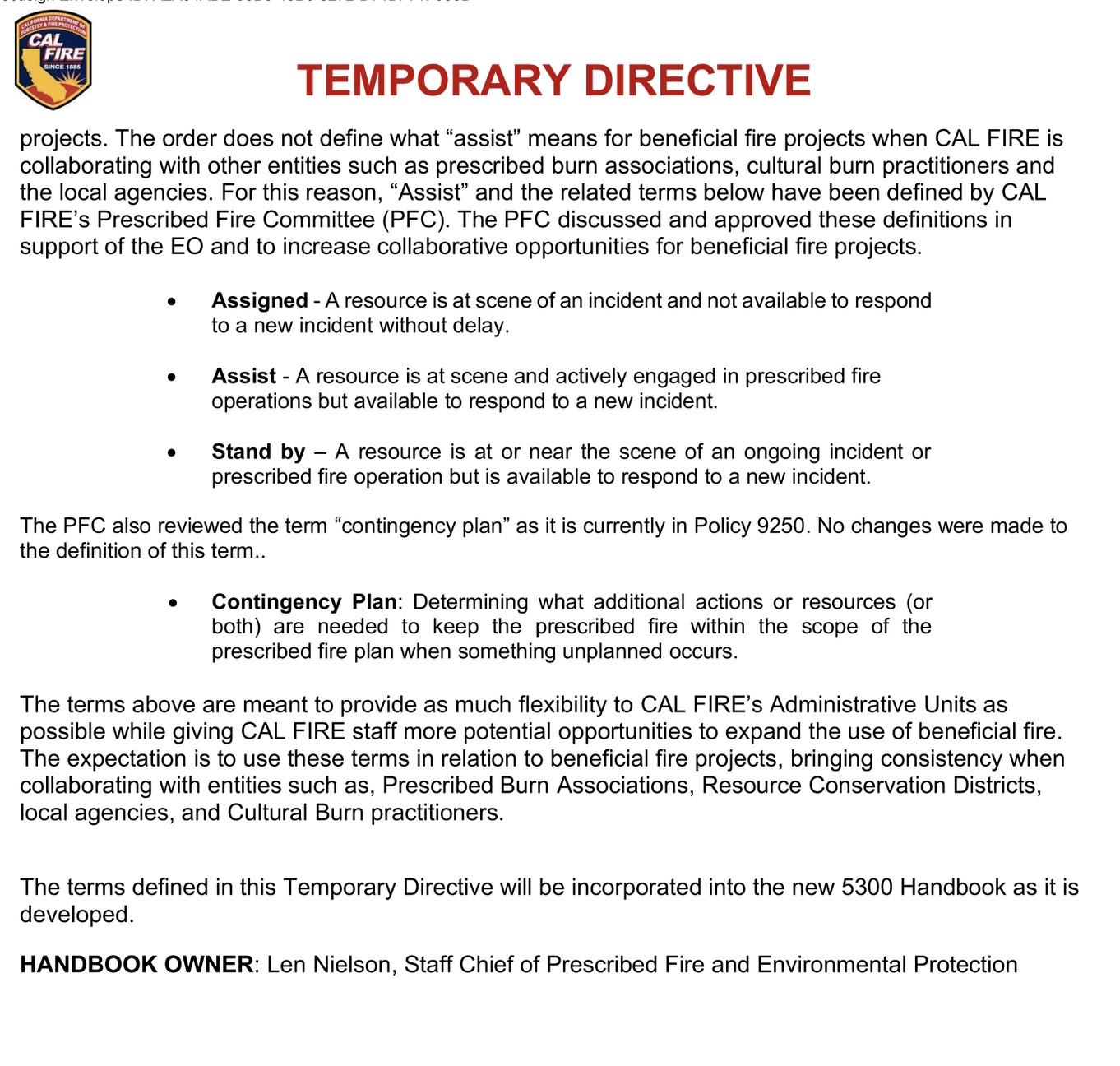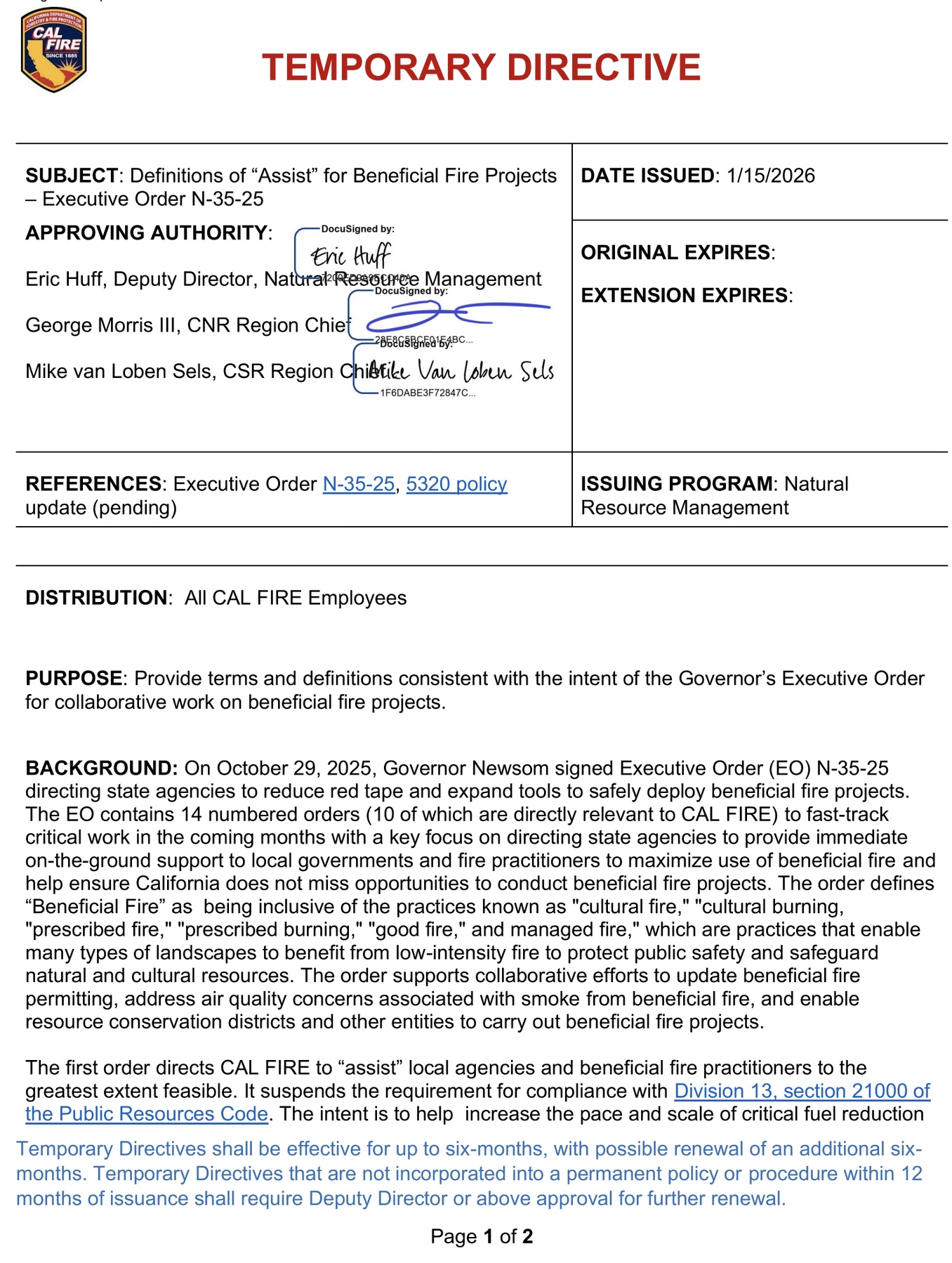 The 1/15/2026 Cal Fire Temporary Directive refers to the October 2025 Executive Order suspending the requirement for Cal Fire assistance on landowner burns to comply with CEQA.