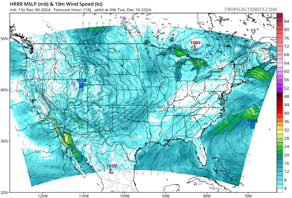 After the small system brushed by the state and tracked into the lower GB the HP is building in and with the cold air pool in place this will produce an efficient offshore flow. From the hi-res model the peak of the offshore winds looks to be tonight. The HRR points to a widespread event with two critical areas. The mountains of LA County and Ventura and the Inland Empire east of Orange and south into San Diego. The winds there could be above advisory levels and cause some general damage.