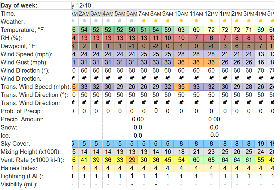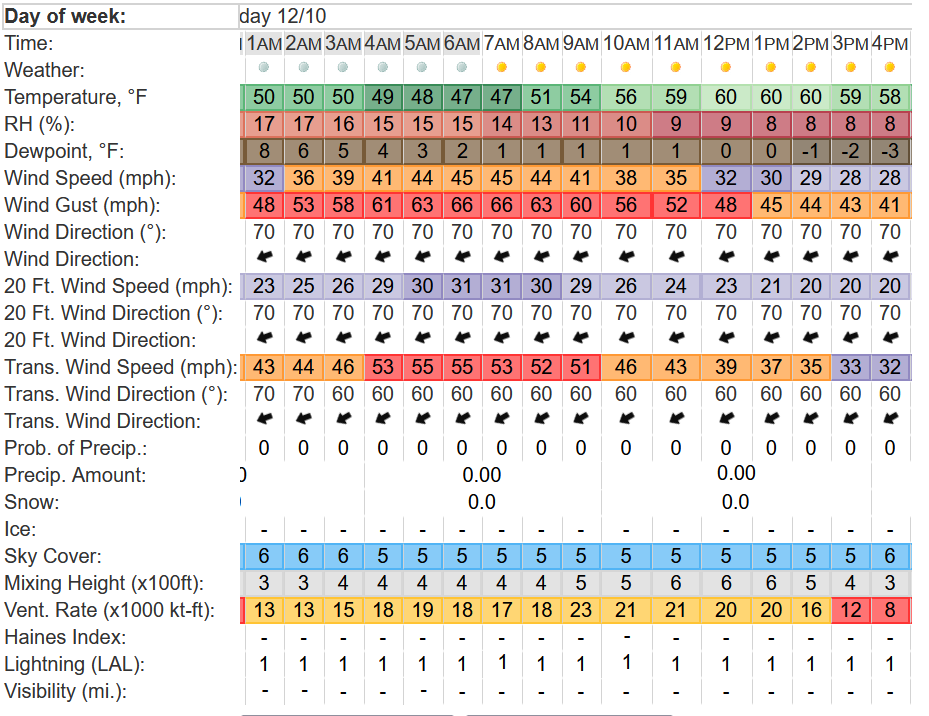 This is a point forecast for Oxnard early Tuesday into the afternoon. Looking at the RH and wind gusts, it looks like mid morning is the most critical timeframe, but all together critical conditions.