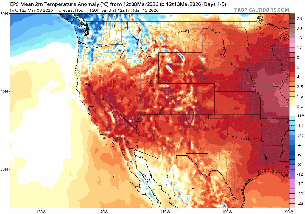 Update: the long range models show strong ridging over us during the next 10-12 days. Potentially record breaking atmospheric heights for this time of year, and if the models verify a record long duration heat wave for March. It’s a little far out, but the models do well with ridging over us in the longer term versus troughing. It will be interesting to see what happens when the ridge breaks down, possibly an exceptionally strong offshore wind event or a return to a quick hitting rain event.